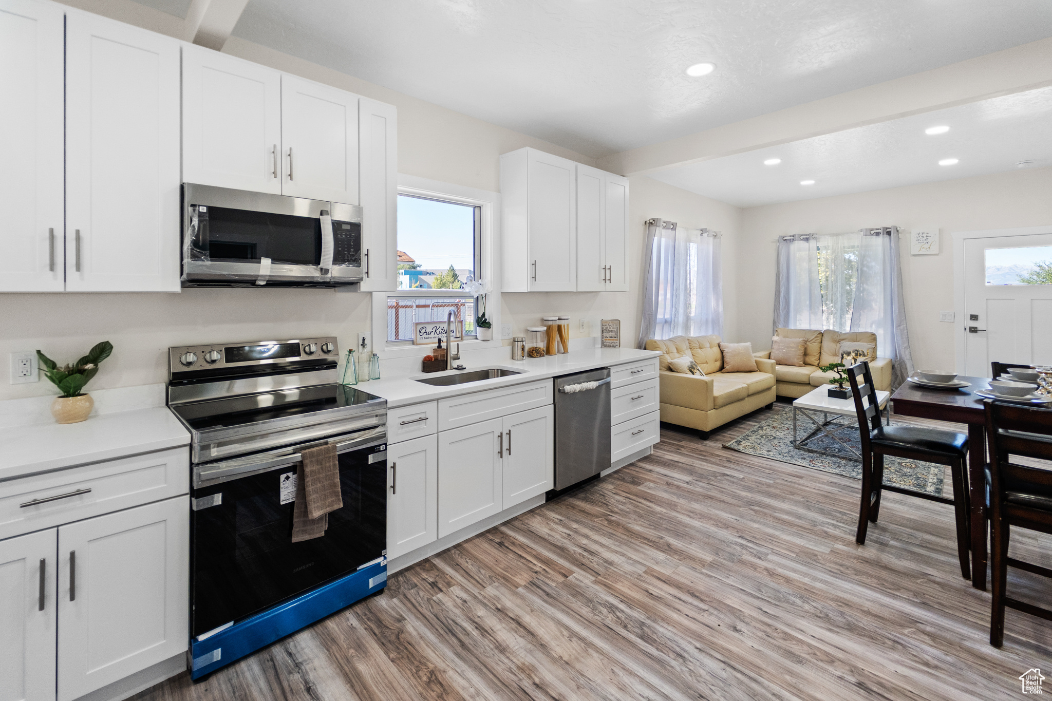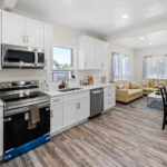This beautifully remodeled 4-bed, 2-bath home features an open floor plan with vaulted ceilings and plenty of natural light. The all-new kitchen is a showstopper, with sleek cabinetry, quartz countertops, and brand-new appliances—perfect for cooking and entertaining.